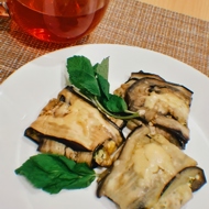 Place two slices of eggplant in a cross shape. In the center of each pair, place 2 tablespoons of the filling. Fold the ends of the slices towards the center and press with your hands. Sprinkle the remaining cheese on top. Bake in the oven for 5 minutes.