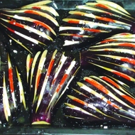 Cut the tomatoes and feta cheese into wedges. Slice the eggplants in half and make several cuts on each half from the wide end almost to the base, creating a fan shape.