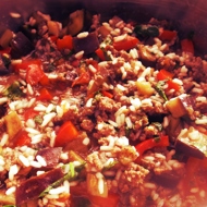 Transfer the meat and vegetables to a pot, add the sautéed eggplants and boiled rice.