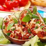 Wash the eggplants, cut them lengthwise, scoop out some of the flesh, rub the insides with salt, and let them sit for a few minutes. Fill the washed eggplants with the stuffing, then place them in a single row on a baking sheet, pour sauce or sour cream over them, and stew in the oven. Once cooked, cool the eggplants and sprinkle with green onions.