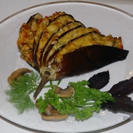 Cut the eggplant lengthwise, making 6 mm slices without cutting all the way through. Salt it and let it sit for 5 minutes, then shake off the liquid that forms. Fill the gaps with a mixture of diced tomatoes, bell peppers, garlic, herbs, cheese, and bacon.