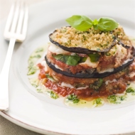 Slice the eggplants lengthwise, dust them with a mixture of flour and salt, then top with a blend of tomatoes, garlic, and cheese. Bake in the oven until cooked through.