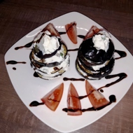 Garnish as desired; I used balsamic cream and cherry tomatoes.