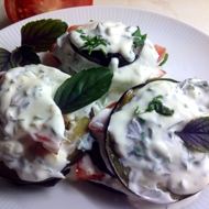 Layer the fried eggplant rounds and tomato slices alternately in a stack, spreading sour cream on each layer.