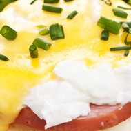 Prepare the hollandaise sauce. In a small bowl, place the egg yolks, 1 tablespoon of water, a pinch of salt, and mix. Place over a double boiler (the bowl should not be fully submerged in water, just touching the water at the bottom).