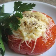 Cut off the top of the tomato and remove the seeds. Grease the inside of the tomato with oil, and season with salt and pepper.