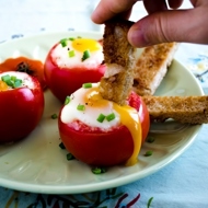Place the hollowed tomatoes on the baking sheet. Add a teaspoon of butter to each. Crack an egg into each tomato. Season with salt to taste. Bake for 25-30 minutes.