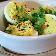 Boil the eggs hard in boiling water, then transfer them to ice water for a while, and peel. Cut in half lengthwise and remove the yolks (you will need only 6 yolks).