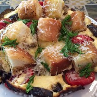 Whisk the eggs with sour cream, season with salt, and pour over the eggplants and tomatoes. Top with the toasted bread. Cook on low heat under a lid until set. Serve with herbs and cheese!