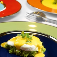 A variation on the classic café appetizer — hard-boiled eggs with mayonnaise and green peas. In this new version, a poached egg is prepared, an aioli sauce is made based on the mayonnaise, and the green peas are transformed into a puree with mint.