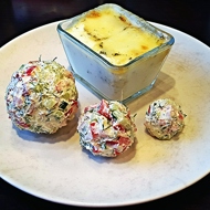 Dice the bell pepper and cucumber into similarly sized small cubes as the turkey. Chop the cilantro. Add everything to the cooled turkey. Mix in the soft cheese gently. Form balls from the creamy mixture and carefully place them on a plate.