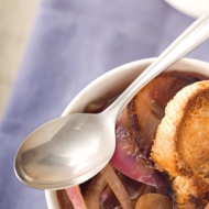 Season the soup with salt and pepper and add water as needed (the consistency should be similar to light cream). Add lemon juice, ladle into bowls, and top with caramelized onions.