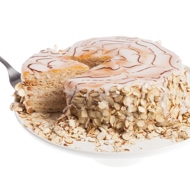 The Estherhazy cake is easily recognizable by its decorative glaze. It features a fondant glaze with a chocolate pattern, as well as apricot jam and almonds. The result is delicate and sweet, with the jam adding a touch of tartness to the overall flavor. A significant amount of almonds is required, as they are included in the batter and used to decorate the cake.