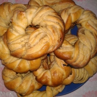 Place the risen dough on the counter. Divide the dough into 6 pieces. Roll each piece into a rectangle, spread the butter mixture (leave some for the top), and roll it into a log. Cut it in half lengthwise, without cutting all the way through. Twist it like a rope. Pinch the ends together to form a wreath. Brush the top with the remaining butter mixture.