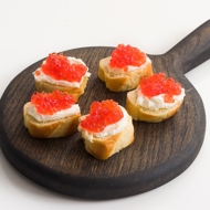 Spread cream cheese on a piece of brioche and top it with faux caviar.