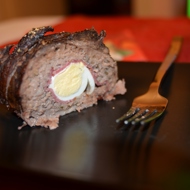 Remove the roll from the oven, carefully remove or cut the 'ties,' and serve with the tomato sauce, sliced into portions.