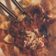 Cook the farfalle in salted water until slightly undercooked (al dente). Drain and mix with the Bolognese sauce. Sprinkle with cheese and fresh thyme.