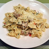 Cook the farfalle pasta until al dente. Boil for no more than 5 minutes, remove from heat and let it sit in the water for about 2 minutes, then drain in a colander.