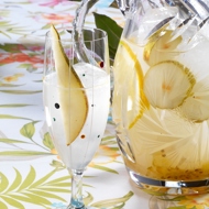 Serve in glasses filled with ice. Garnish with slices of pear and lemon.