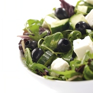 In a bowl, mix the sliced fennel bulb, 1 tablespoon of fennel fronds, thinly sliced red onion, halved olives, parsley, vinegar, pepper, and salt. Add the feta and gently mix.