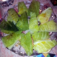 Arrange the toasts on a large plate — one leaf of cabbage, one toast, 2–3 leaves of cabbage. Drizzle with oil again on top.
