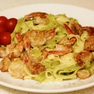 Add the cooked pasta to the prepared shrimp sauce, then add zucchini, garlic, and lightly sprinkle with Parmesan.