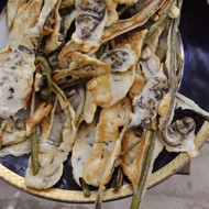 Dip the fiddlehead (fern frond) in the batter and transfer it to the skillet for frying. Fry on both sides.
