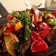 Cut the vegetables into large slices. Sauté separately in a pan. Add the meat and sauce.