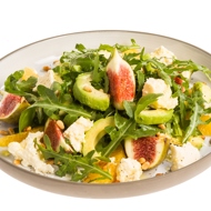 A refreshing salad featuring figs, creamy avocado, and artisanal farm cheese, perfect for a light lunch or as a side dish for dinner.