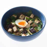 Ladle the soup into bowls, adding the eggplant, sliced green onions, and any remaining julienned ginger. Top each bowl with half a boiled egg, sprinkle with chopped cilantro and any other herbs to taste, and garnish with crispy fried onions.