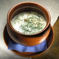 Pour the nearly finished soup with milk, add salt. Important: when the milk is heated but has not yet formed foam, add the butter!