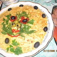 Boil the fish in salted water, break it into small pieces, and place it at the bottom of a flat dish.