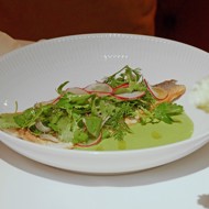 Pour the sauce onto the bottom of the plate, place the fish on top, and add the green salad on top.