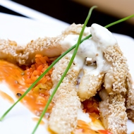 Mix the breadcrumbs with half of the sesame seeds. Dip each piece in yogurt, then in the mixture of sesame seeds and breadcrumbs.