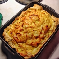 Grease a baking dish with oil and line it with parchment paper. Lay out the puff pastry and form the edges.