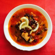 The type of fish is not that crucial. The main rule is to stick to one fresh, one hot-smoked, and one lightly salted fish. Fish solyanka can be served, like meat solyanka, with sour cream, but in the fish version, it might be unnecessary as it would overpower the delicate taste of the three types of fish. However, for those who enjoy some spiciness, you can certainly add it not only with red or black pepper but also with Russian mustard, which can be diluted with a small amount of fish broth and poured into the soup when serving.