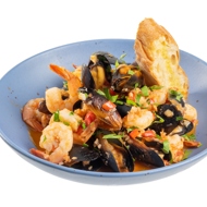 Then add the tomatoes (Italian canned, peeled, and diced pomodori pelati are best, and they can be found in most stores). Simmer for another ten minutes, then add pieces of cod fillet, wine, and cook for another 3-5 minutes. After that, add the mussels and shrimp and cook for another 3-5 minutes; add sugar, salt, and pepper to taste.