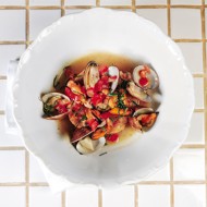 Scatter the opened mussels over the plate with the breadcrumbs. You can remove half of them from their shells (it's convenient to use one of the empty shells for this, as it has a sharp edge), while the other half can be left in their shells – and let the diners feel free to dig in with their hands.