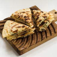 Another prototype for our garden treats is jengyalov hats. Translated from Armenian, it means 'flatbread with herbs,' which accurately captures the essence of this dish. Typically, jengyalov hats are prepared in the mountains using over 40 different types of herbs. To be honest, we didn't grow that many in our garden, but it still turned out delicious with the greens we have. An important point: the herb flatbread is particularly delightful when paired with something sour dairy. You can either dip it in yogurt or add cottage cheese to the filling. We chose the latter option.