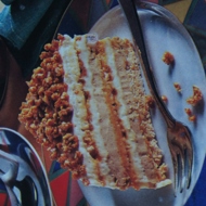 Take one layer, spread cream on it, drizzle with mocha cream, sprinkle with praline, and cover with the next layer. Spread cream on it just like the first, drizzle with mocha cream, sprinkle with praline, and cover with the next layer. Repeat with cream, mocha, and praline. Place in the refrigerator to prevent it from spreading!