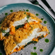 Remove the omelette from the skillet and carefully cut it into portions. Garnish with microgreens and green oil.