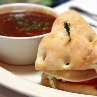 Focaccia sandwiches with arugula, mozzarella, pickled red onion, and tomatoes