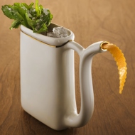 The Fog Cutter is a tiki-style cocktail, carefree and Polynesian; the more fun and unusual its presentation, the better. We adapted a porcelain mug for this mix, similar to those used in spa resorts.