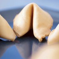 Remove the baking sheet from the oven and quickly, while the circles are still warm, take them one by one, place a folded wish inside, and then fold it in half again, with the crease inside, similar to dumplings, but ensuring that the corners do not touch each other.