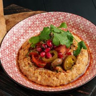Carefully place the salad on top of the bean base and sprinkle with pomegranate seeds.