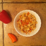 Finely chop the garlic and chili pepper; slice the onion, bell pepper, and chicken fillet (I use breast).