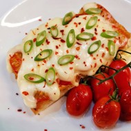 Place the sandwich and sautéed cherry tomatoes on a plate. Add the green onion and chili flakes. Ready!