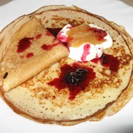Place the crepes on a plate. Spread with strawberry jam, then with whipped cream, fold the crepe in half, and serve.