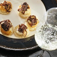 Using a pastry bag, pipe the omelet into the puff pastry cups, then top with caramelized onions.