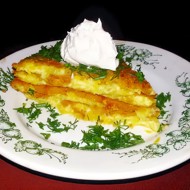 Pour the mixture onto a preheated skillet greased with vegetable oil. Cook on low heat under a lid. Flip the omelette, cover the skillet again with a lid, and cook on low heat. The finished omelette can be served with sour cream or simply on its own.